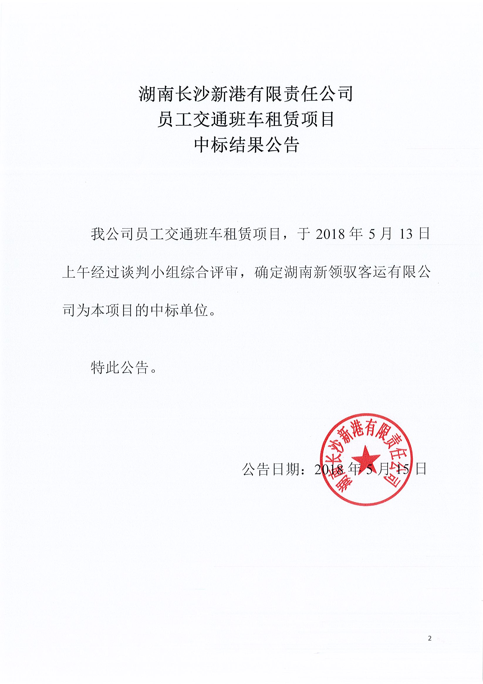湖南長(cháng)沙新港有限責任公司 員工交通班車(chē)租賃項目中標結果公告
