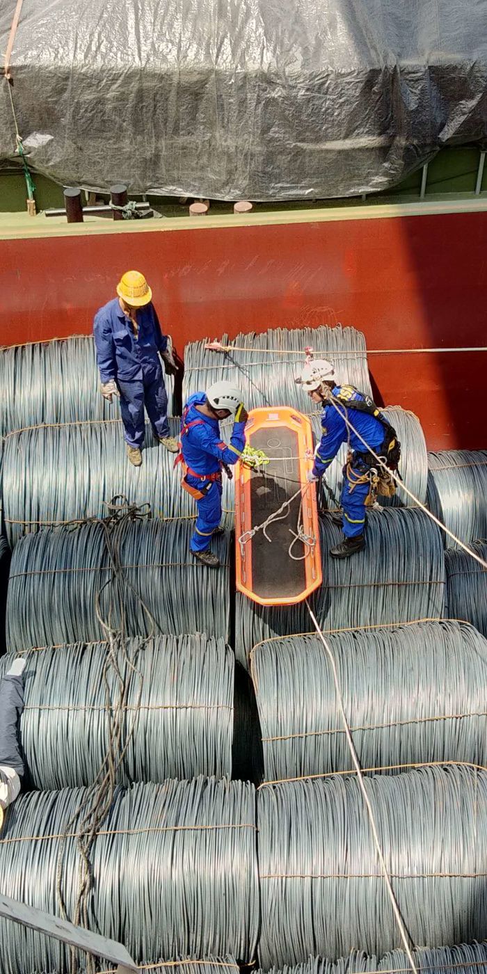 藍天救援隊員將受傷裝卸工固定在擔架上,準備救援上岸。
