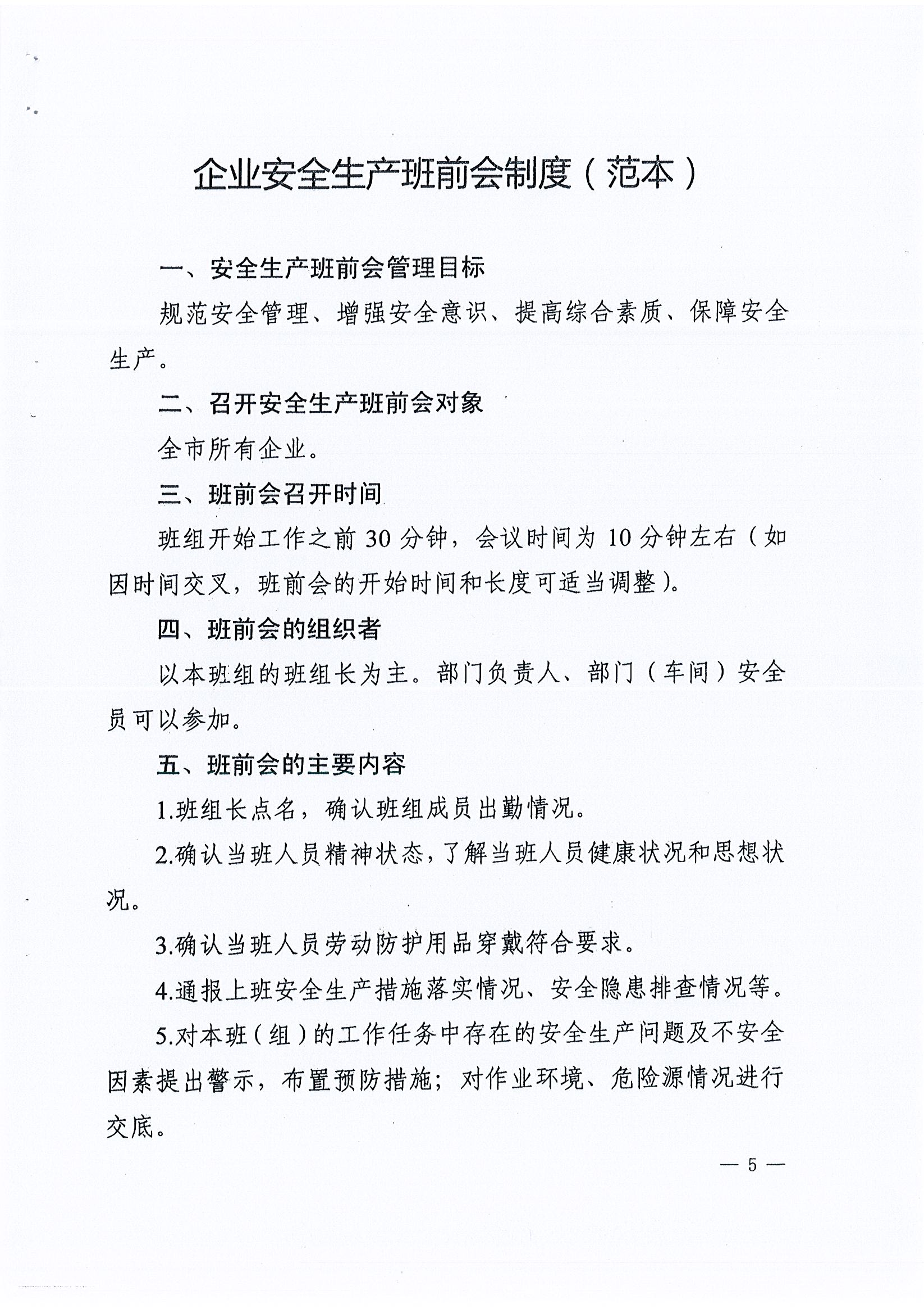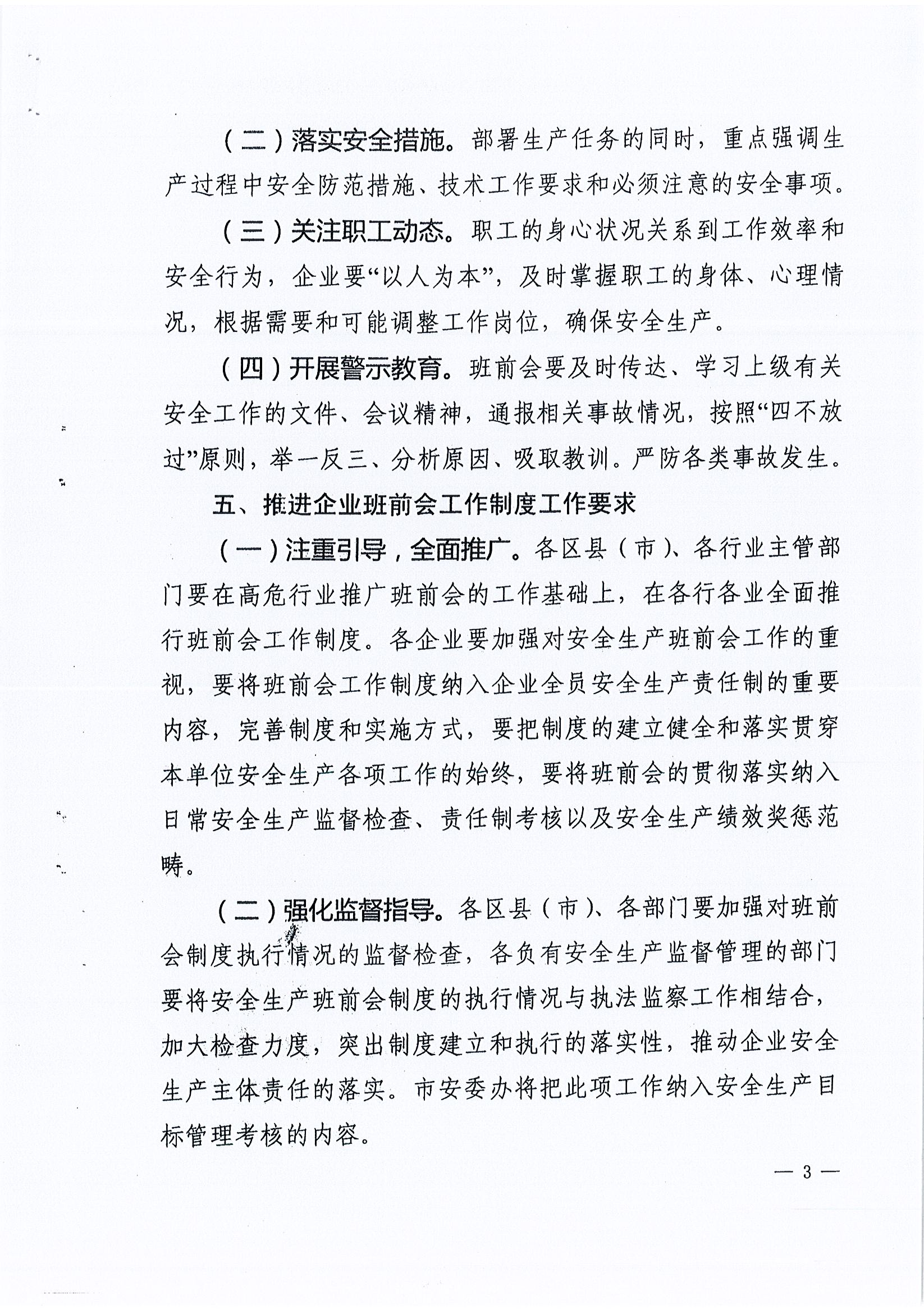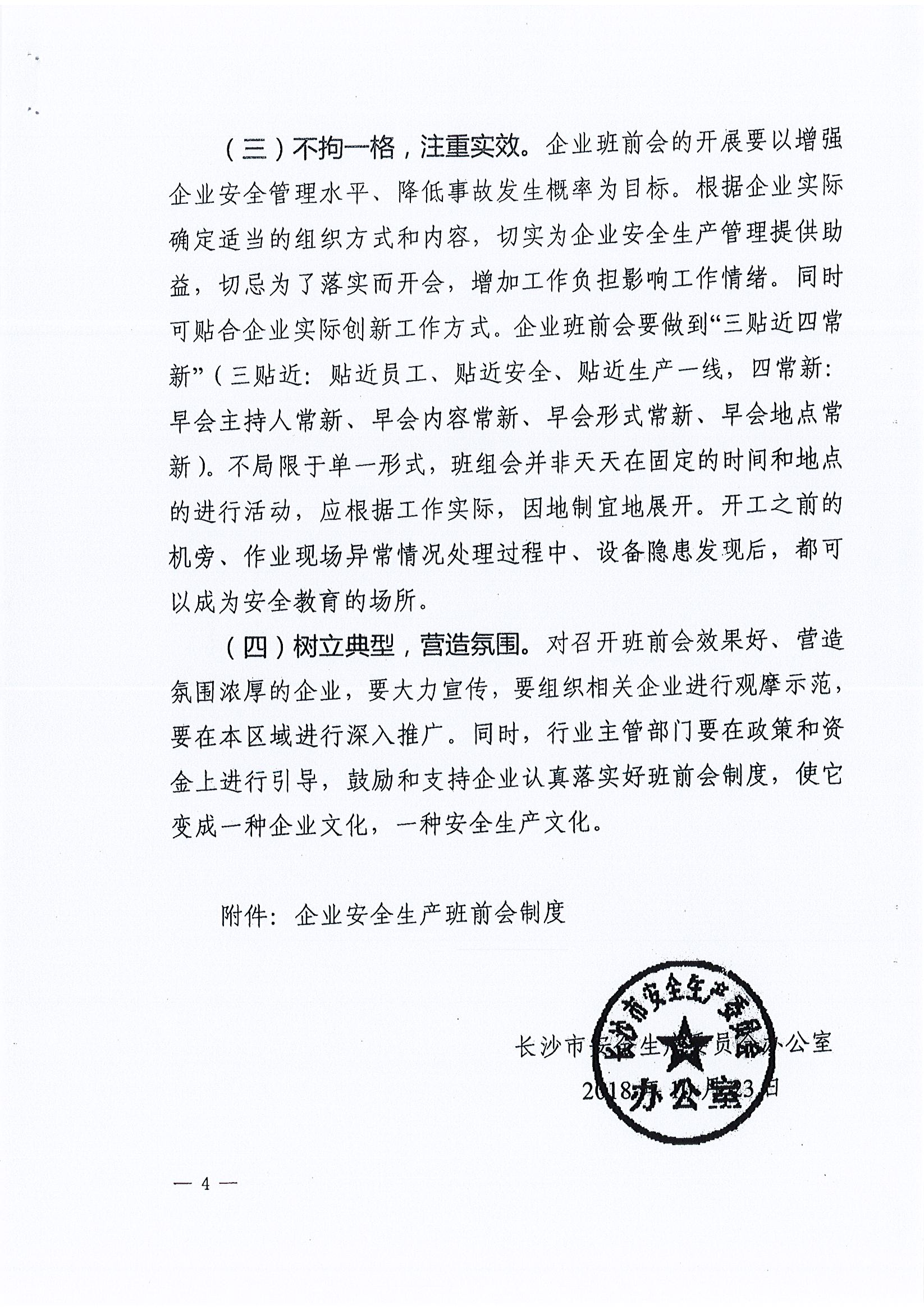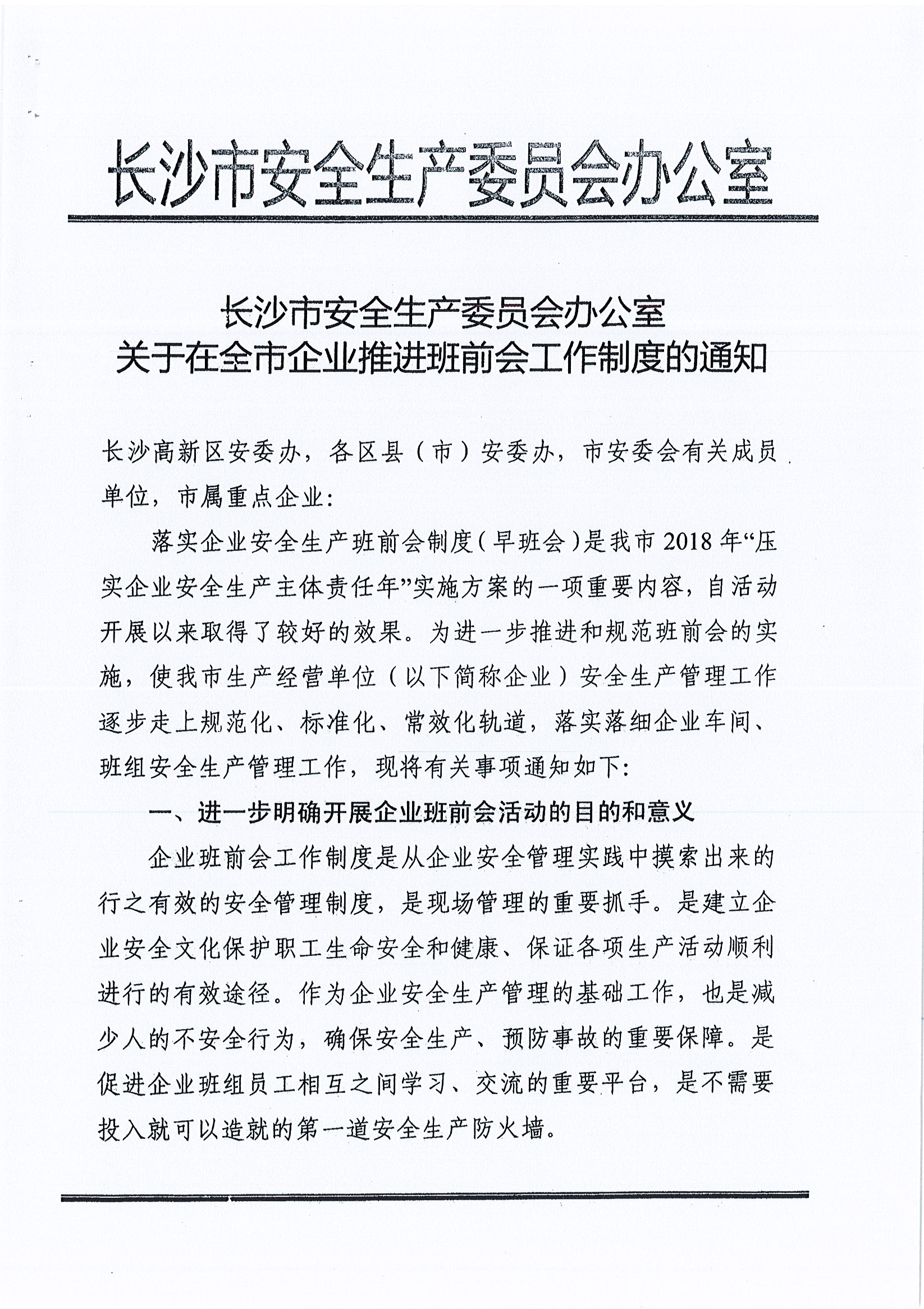 長(cháng)沙市安全生產(chǎn)委員會(huì )辦公室關(guān)于在全市企業(yè)推進(jìn)班前會(huì )工作制度的通知
