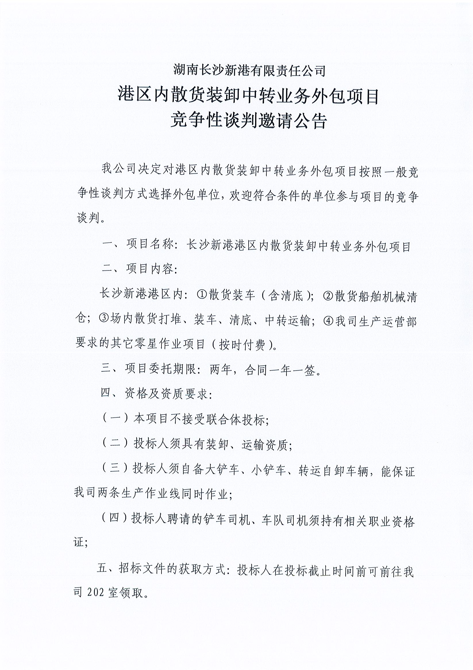 湖南長(cháng)沙新港有限責任公司港區內散貨裝卸中轉業(yè)務(wù)外包項目競爭性談判邀請公告