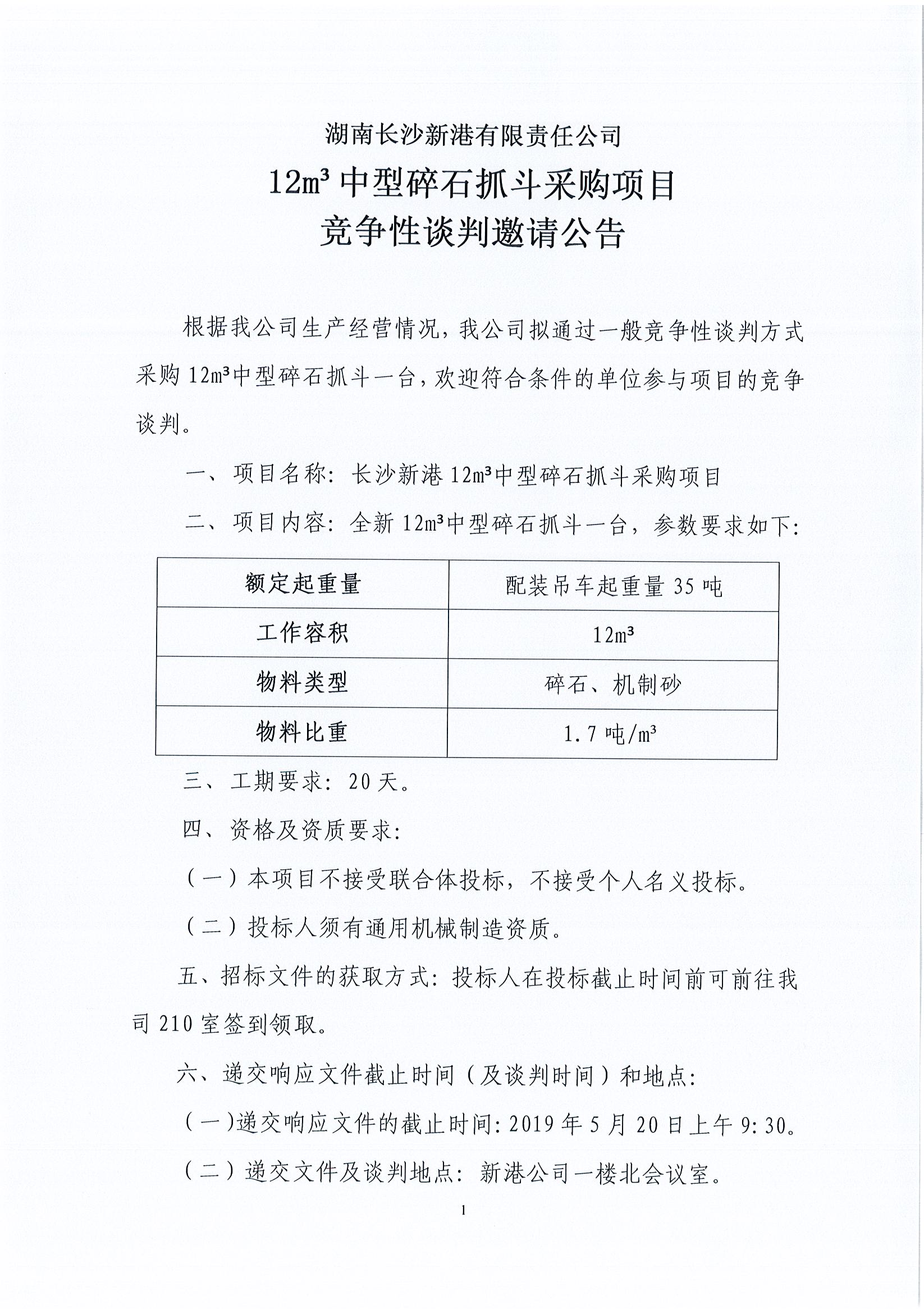 湖南長(cháng)沙新港有限責任公司12m³中型碎石抓斗采購項目競爭性談判邀請公告
