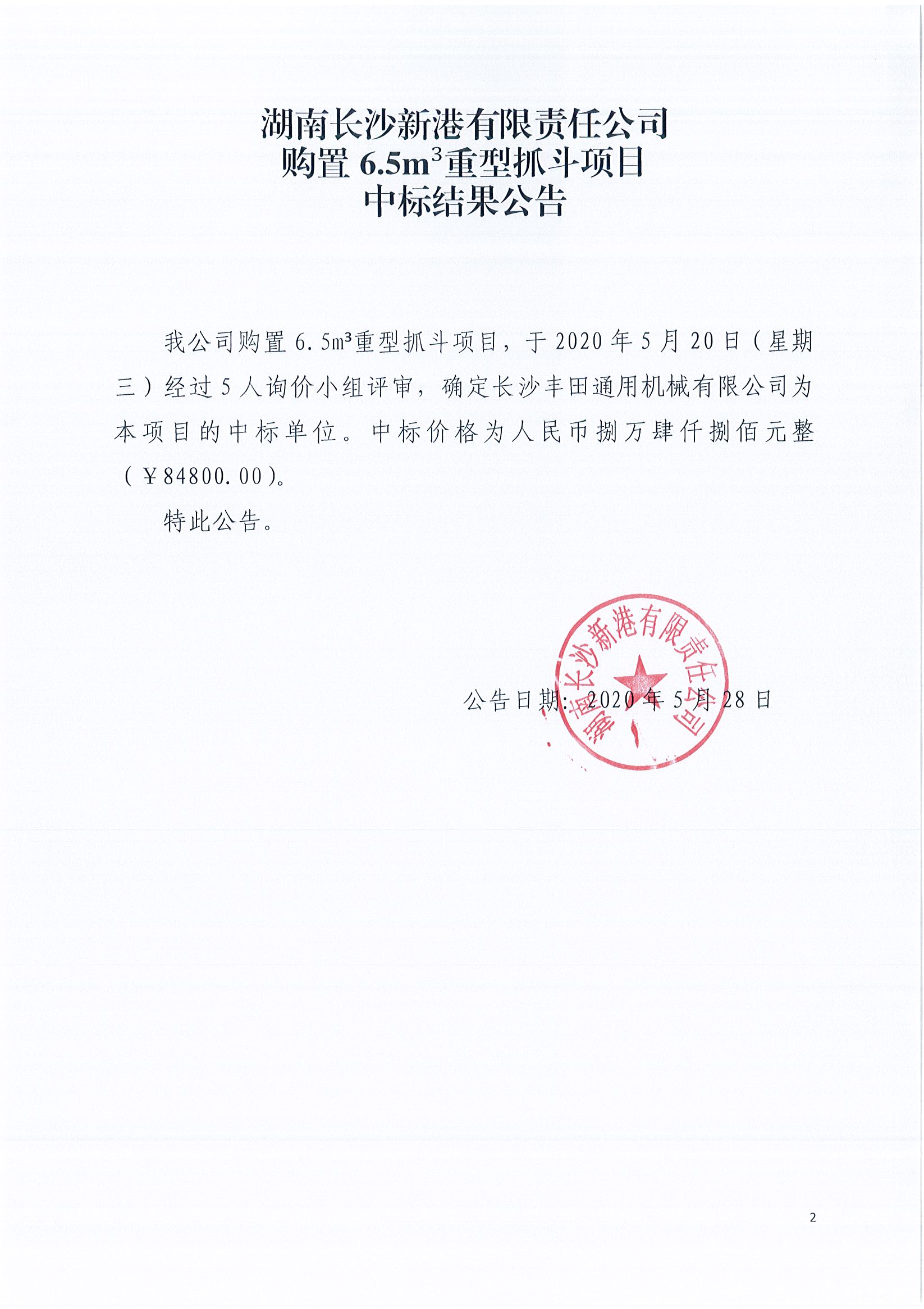 購置6.5m³重型抓斗項目《中標結果公告》