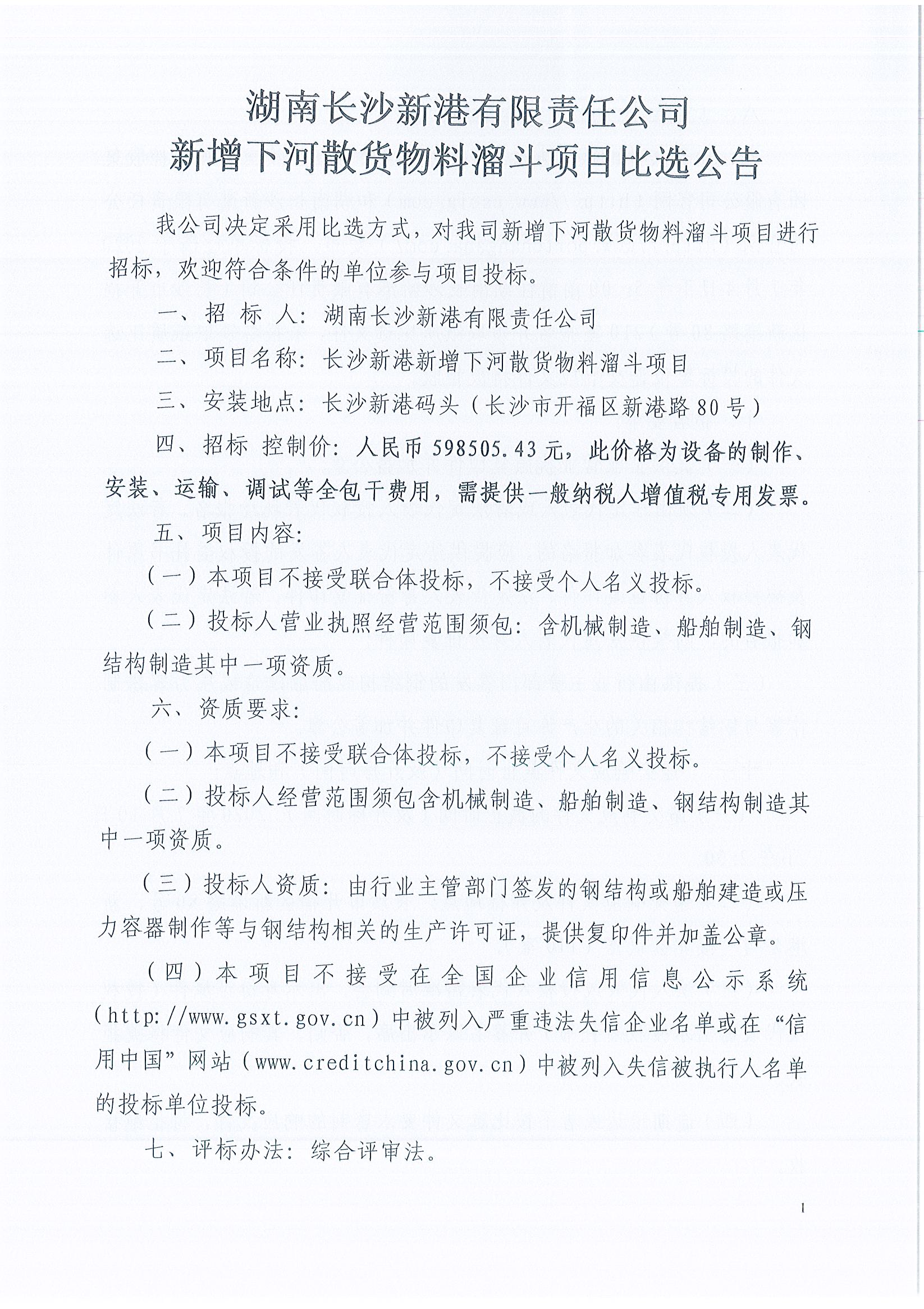 湖南長(cháng)沙新港有限責任公司新增下河散貨物料溜斗項目比選公告