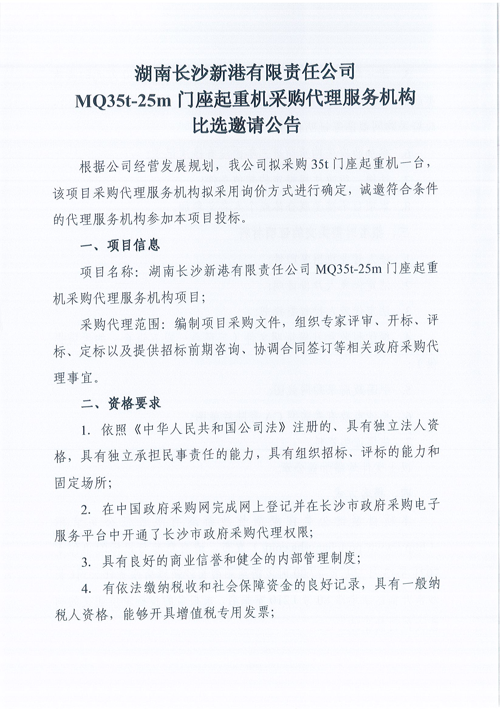 湖南長(cháng)沙新港有限責任公司MQ35t—25m門(mén)座起重機采購代理服務(wù)機構比選邀請公告