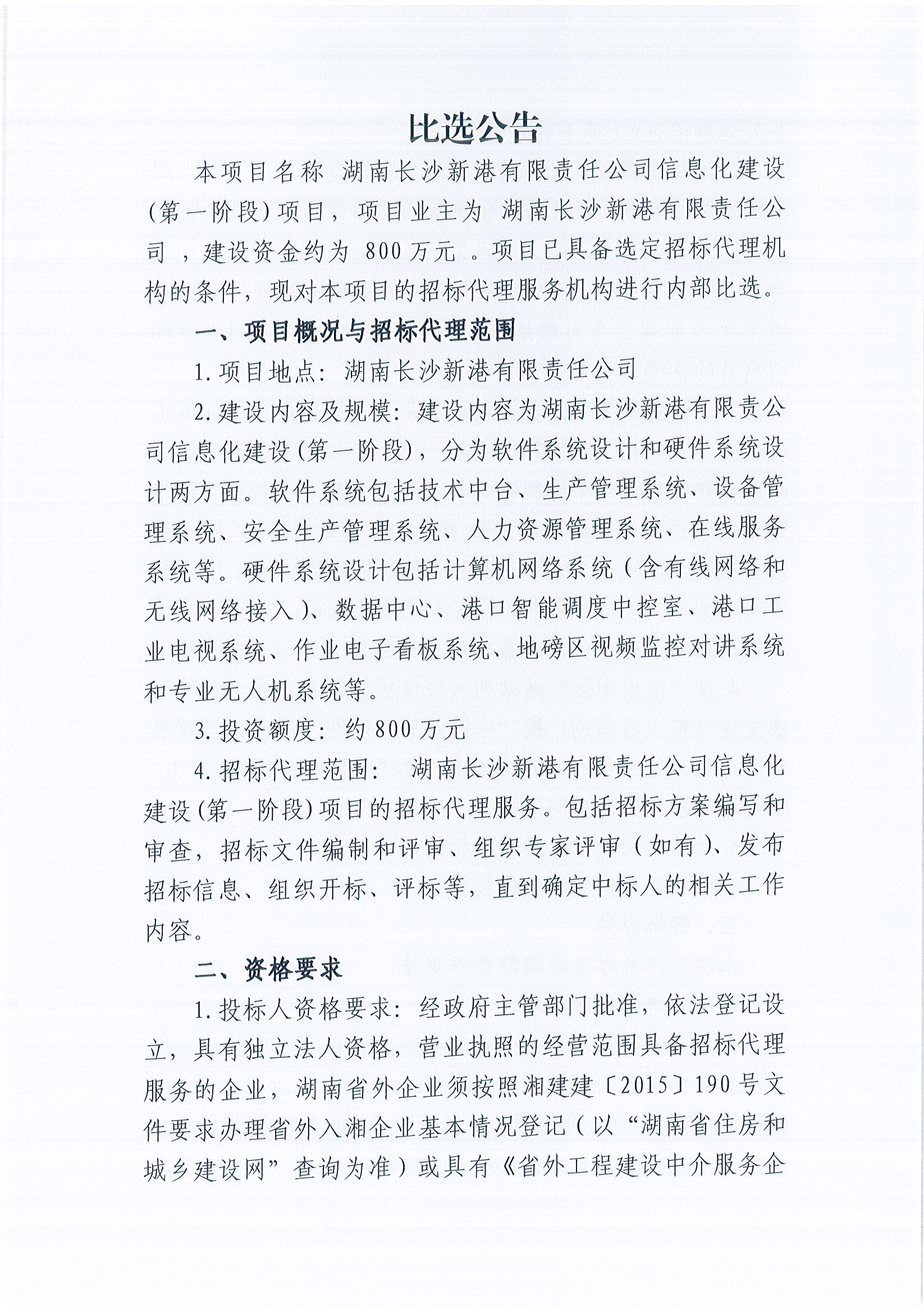 湖南長(cháng)沙新港有限責任公司信息化建設(第一階段)招標代理服務(wù)機構比選公告